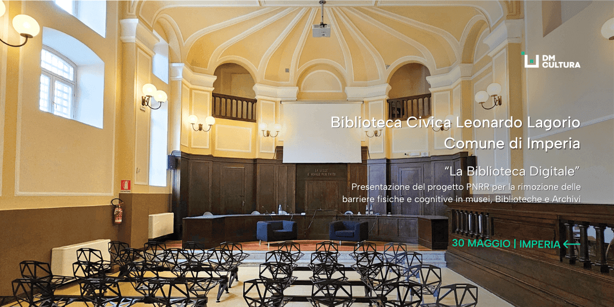 Il 30 maggio, dalle ore 9.30, siamo lieti di invitarti alla Biblioteca Civica "Leonardo Lagorio" del Comune di Imperia per l’evento “La Biblioteca digitale”, durante il quale verrà presentato al pubblico il nuovo progetto per la rimozione delle barriere fisiche e cognitive, parte del bando PNRR rivolto a musei, biblioteche e archivi.